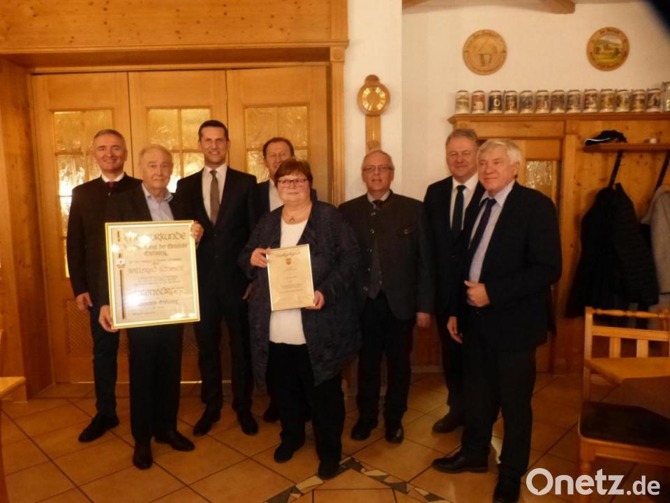 Als Musterbeispiel können anstelle vieler anderer Ehrenamtlichen für ihre besonderen Verdienste zwei Personen gewürdigt werden. Elfriede Wirbel leitet seit langen Jahren den Gartenbauverein Schmidtstadt. Dieser sorgt für ein freundliches Bild der Orte mit Blumen an Häusern, in Gärten und auf gemeindlichen Plätzen. Die Pflege im Naturbereich schmiedet auch den Zusammenhalt im gesellschaftlichen Miteinander, betonte Berr. Der langjährige Gemeinderat und 2. Bürgermeister Wilfried Schmidt hat sich neben diesen Ämtern und seinem Beruf noch sehr aktiv in der Führung von Vereinen engagiert. Berr: "Sein tatkräftiger Einsatz hat das kulturelle und gesellschaftliche Leben in Schwung gehalten." In Würdigung dieser Verdienste wurde Schmidt zum Ehrenbürger von Etzelwang ernannt.
