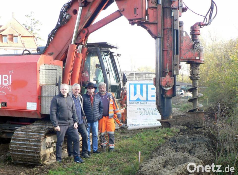 Bürgermeister Jürgen Kürzinger (links) und Bauhofleiter Jörg Dollhopf (dritter von links) machen sich zusammen mit Diplomingenieur Jürgen Sczygiol (Zweiter von links), Firma Wilhelm Bauer aus Erbendorf, ein Bild von dem Baufortschritt des Regenrückhaltebeckens in der Kalkofenstraße. Rechts steht Polier Hans Wopperer.