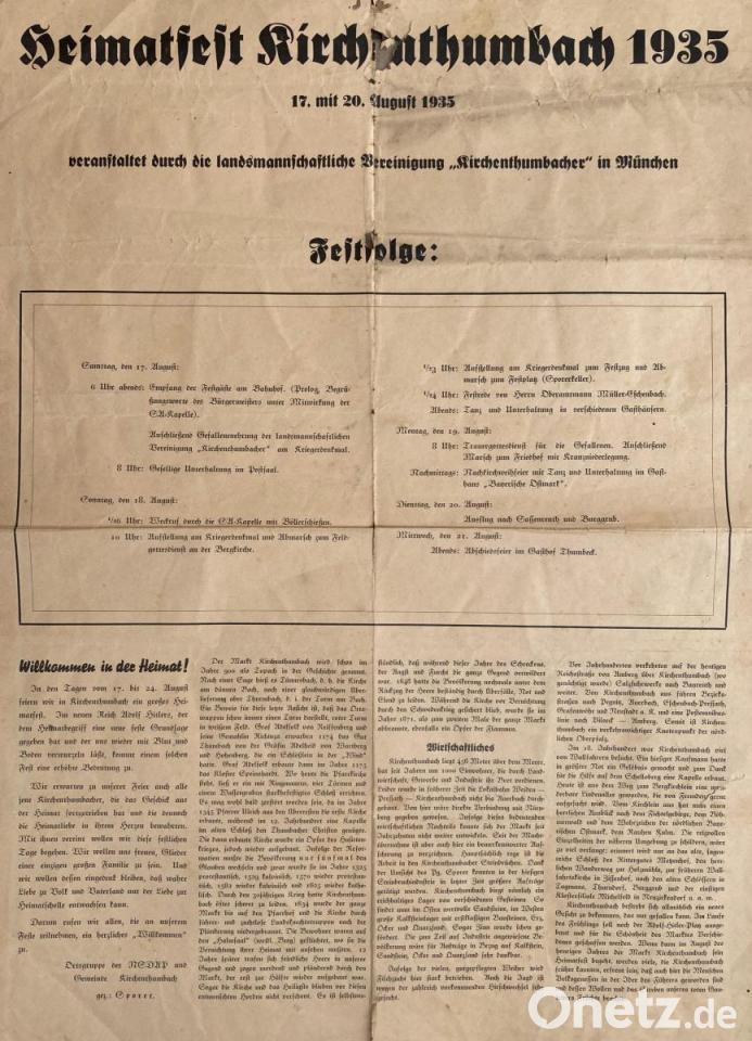 Am zurückliegenden Wochenende feierten die Kirchenthumbacher Kirwa. Es ist jetzt 85 Jahre her, da herrschte aus diesem Anlass in den Wirtshäusern ein ganz besonderer Hochbetrieb: Zur Kirchenthumbacher Kirchweih und zur Präsentation der neuen Standarte in der Heimat veranstaltete die "Landsmannschaftliche Vereinigung Kirchenthumbach" vom 17. bis 20. August 1935 ein Heimatfest. Deshalb waren auch viele Kirchenthumbacher, die in München lebten, gekommen. Das Programm beinhaltete einen Empfang am Bahnhof mit der SA-Kapelle, eine gesellige Unterhaltung im Postsaal und einen Feldgottesdienst an der Bergkirche. Hinzu kamen ein Festzug zum Festplatz beim Sporer-Keller (Kellerwirt) sowie abends Tanz und Unterhaltung in verschiedenen Gasthäusern. Am Kirchweihmontag standen ein Trauergottesdienst auf dem Programm und nachmittags eine Nachkirchweihfeier mit Tanz und Unterhaltung im Gasthaus "Bayerische Ostmark" beim "Mauerer-Karl". Den Abschluss des Heimatfestes bildete ein Ausflug nach Sassenreuth mit Einkehr "beim Steiger" und nach Burggrub, wo man sich in der alten Schlossschänke beim "Grouwirts-Toni" eine Mass frisches Kellerbier schmecken ließ. Die Abschiedsfeier fand am Mittwoch, 21. August, im Gasthof Thumbeck statt. Begrüßt wurden die Wahlmünchener zum Heimatfest von der Ortsgruppe der NSDAP, vertreten durch Bürgermeister Karl Sporer, mit den Worten: "Im neuen Reich Adolf Hitlers, der dem Heimatbegriff eine neue feste Grundlage gegeben hat und der uns wieder mit Blut und Boden verwurzeln lässt, kommt einem solchen Fest eine erhöhte Bedeutung zu. Wir erwarten zu unserer Feier auch all jene Kirchenthumbacher, die das Geschick aus der Heimat fort getrieben hat und die dennoch die Heimatliebe in ihrem Herzen bewahrten. Mit ihnen vereint wollen wir diese festlichen Tage begehen. Wir wollen uns freuen, Glieder einer einzigen großen Familie zu sein. Und wir wollen dessen eingedenk bleiben, dass wahrer Liebe zu Volk und Vaterland nur die Liebe zur Heimatscholle entwachsen kann. Darum rufen wir allen, die an unserem Feste teilnehmen, ein herzliches Willkommen zu."