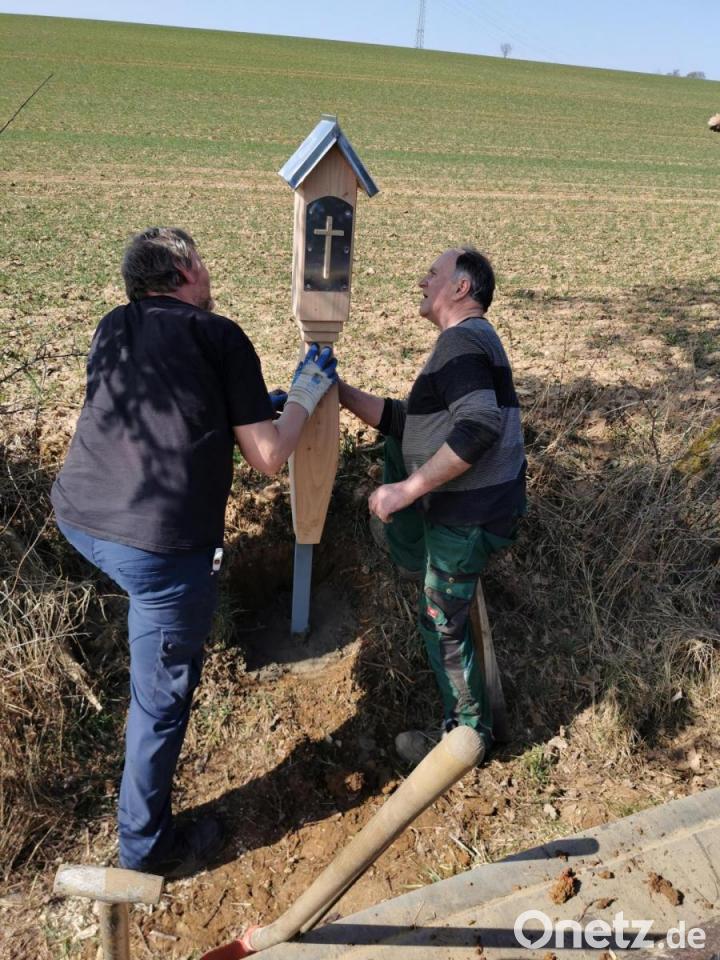 Thomas Schleicher aus Dammesldorf und Georg Lehner aus Göttersdorf, der Flurangrenzer, beim Aufstellen des neuen Feldzeichens.