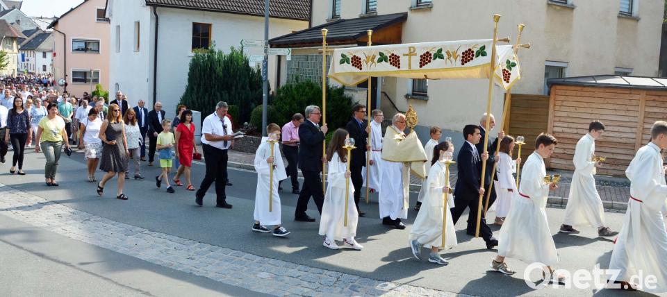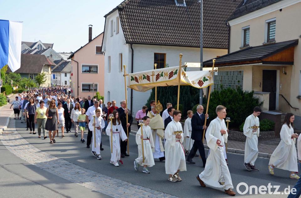 Die Monstranz mit der geweihten Hostie als Leib Christi trug Pfarrer Helmut Süß durch den Ort. Die geweihte Hostie wird als Leib Christie durch die Straßen getragen. Die Hostie befindet sich in der Monstranz, einem liturgischen Gefäß. Sie ist das Kernstück des Christlichen Abendlandes. Die vier Altäre mit bunten Blumenteppichen befanden sich vor den Anwesen Fronhöfer, Rupprecht/Prüschenk und Dobmann sowie auf dem Vorplatz der Kirche. Süß dankte am Ende der Prozession allen, die zum Gelingen des christlichen Festes beigetragen haben.