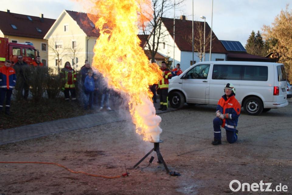 Die Gemeinde hatte circa 50 Jugendliche im Verwaltungsbereich angeschrieben. Und so kamen diesmal mehr als im letzten Jahr, um die Vorführungen am Gerätehaus zu sehen. Und da auch viele Eltern dabei waren, durften diese gleich ihr Können am Feuerlöscher demonstrieren und trainieren.