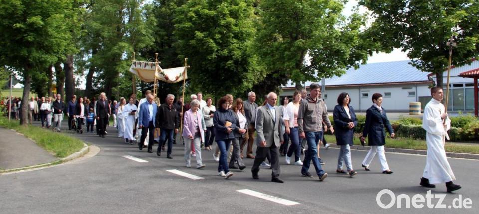 Nach den Bittgängen nach Metzenhof, zur Forstkapelle und der Bergkirche machten sich die Gläubigen mit dem eucharistischen Brot am Sonntag auf den Weg hinaus in die Straßen und Fluren der Pfarrgemeinde. Nach dem Gottesdienst trug Pfarrer Augustin Lobo das Allerheiligste hinunter in die Görglaser Straße, weiter zum Sandbrunnen und zurück zur Kirche. An den vier Altären hörten die Gläubigen das Wort Gottes und sangen und beteten für die Früchte der Erde sowie für die Menschen in der Pfarrgemeinde. Erstmalig übernahmen die Burschen des Katholischen Burschenvereins das Tragen des Baldachins. An der Prozession nahmen auch Familien mit Kindern und Ukrainer teil.