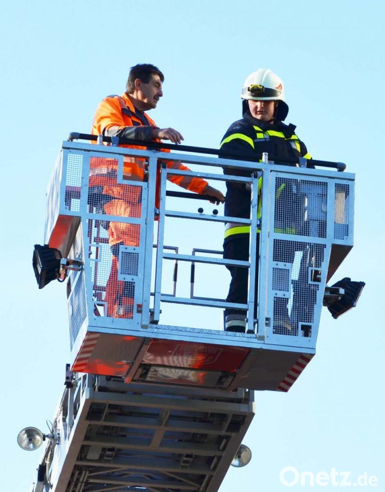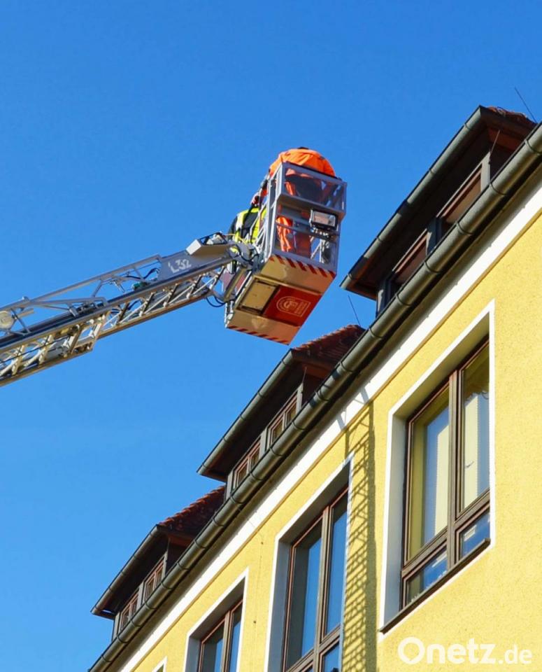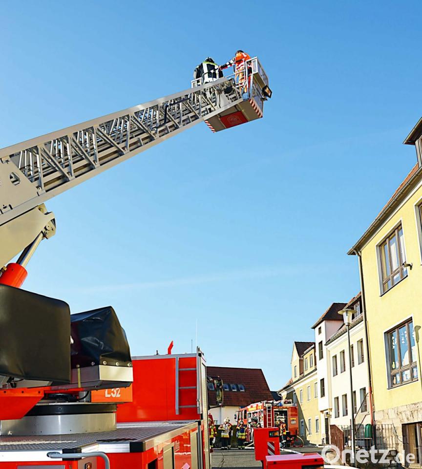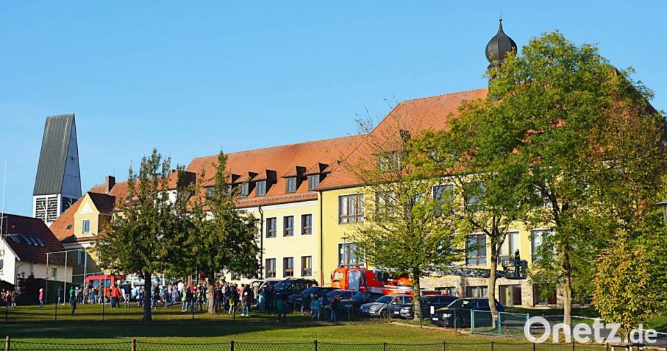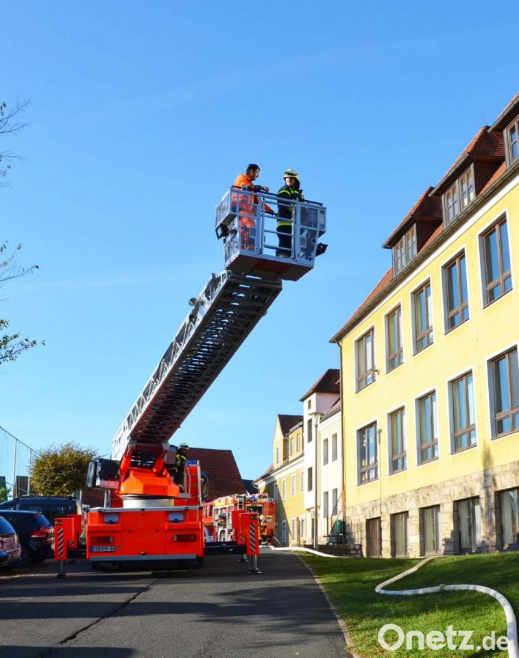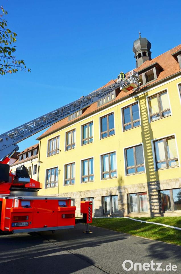 Bei dem Szenario handelte es sich um eine Übung an der Grund- und Mittelschule, bei der ein Feuer im Heizraum der Einrichtung ausgebrochen war. Der Hausmeister befand sich, als die Flammen den Mehrzweckraum erreichten, im Dachgeschoss und gelang über das Treppenhaus nicht mehr ins Freie - die Feuerwehrleiter aus Eschenbach musste her.
