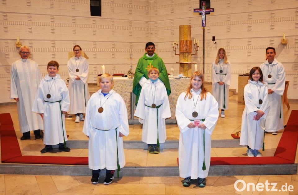 An Alina Hanauer, Eleonora Raps, Jannik Renner, Jonas Püttner und Johann Wiltsch überreichte der Geistliche als äußeres Zeichen ihrer neuen Aufgabe ein Kreuz zum Umhängen sowie den Ministrantenausweis. Die 17 Ministranten, die verabschiedet wurden, erhielten eine Dankesurkunde sowie von Oberministrantin Pia Schecklmann einen Engel aus Bronze. Im Anschluss an den Gottesdienst lud die Pfarrei alle Minis zu einem Pizzaessen in das Pfarrheim Sankt Josef ein.