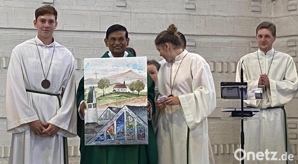 Am Ende des Gottesdienstes würdigte Pfarrgemeinderatsvorsitzender Richard Zeitler Pfarrer Lobos Tätigkeit. Bedankte sich recht herzlich und wünschte ihm in seinem neuen Wirkungskreis Gottes Segen. Oberministrantin Michelle Gläser verabschiedete Pfarrer Lobo im Namen der Ministranten ebenfalls herzlich und drückte ihre Dankbarkeit für seine Unterstützung und sein Vorbild aus. Als Abschiedsgeschenk überreichten sie ihm ein Gemälde, dass die Pfarrkirche und die Bergkirche zeigt – zwei Orte, die für ihn und die Gemeinde von großer Bedeutung sind.