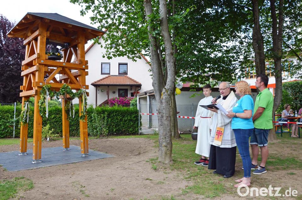 Beim Sommerfest der Einrichtung segnete Pfarrer Helmut Süß den von der Zimmerei Reisner errichteten neuen Glockenturm sowie die altehrwürdige Glocke. Diese läutete über 100 Jahre lang bis 2016 zum Gebet und Gottesdienst in der Bergkirche Maria Zell. Seine Ansprache dabei war auch für die Kinder leicht verständlich. Es gebe viele Türme, zum Beispiel Kirchen-, Kletter-, Aussichts-, aber auch Glockentürme erklärte der Geistliche. Ein solcher stehe jetzt beim Kinderhaus. "Die Glocken rufen uns", sagte Pfarrer Helmut Süß. Er erinnerte daran, dass es Pater Dr. Benedikt Röder gewesen sei, der sich für die Glocke auf dem Kinderhausgelände als neuen Standort eingesetzt habe.