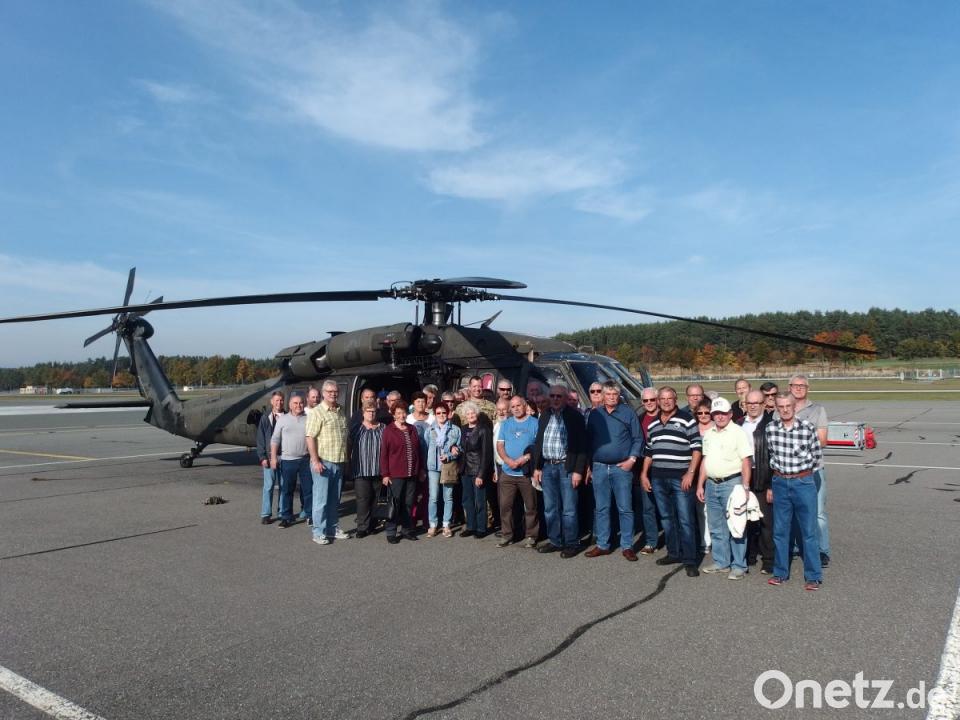 Auch einen Rettungshelikopter konnten die Besucher bestaunen. Ein Pilot erklärte ihnen schließlich, wie so ein Hubschrauber funktioniert. Da immer ein Sanitäter an Bord ist, kann der Helikopter bei einem Notruf sofort "in die Luft gehen". Anhand von Munitionsteilen gab Gerald Morgenstern im Übungsgelände, welche Munition verwendet wird. Anschließend ging es für die Kirchenthumbacher zum "Schwarzen Berg". Von dem Aussichtspunkt aus waren nicht nur US-Artillerieeinheiten zu sehen - das gute Herbstwetter erlaubte auch eine großartige Fernsicht. US-Soldaten, die in Grafenwöhr üben, verewigen sich auf diesem Turm. Das war auch für Elvis Presley ein Muss. Der Schriftzug des Musikers war für viele Kirchenthumbacher ein begehrtes Fotoobjekt. Während der Rundfahrt bot sich der Gruppe auch ein Blick auf die Neubauten im Grafenwöhrer Truppenlager. Hier wurden für Soldaten und ihre Angehörigen große Sporthallen und -plätze geschaffen. Jährlich findet auf einem neuen großen Gelände das Deutsch-Amerikanische Volksfest statt.