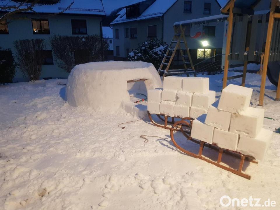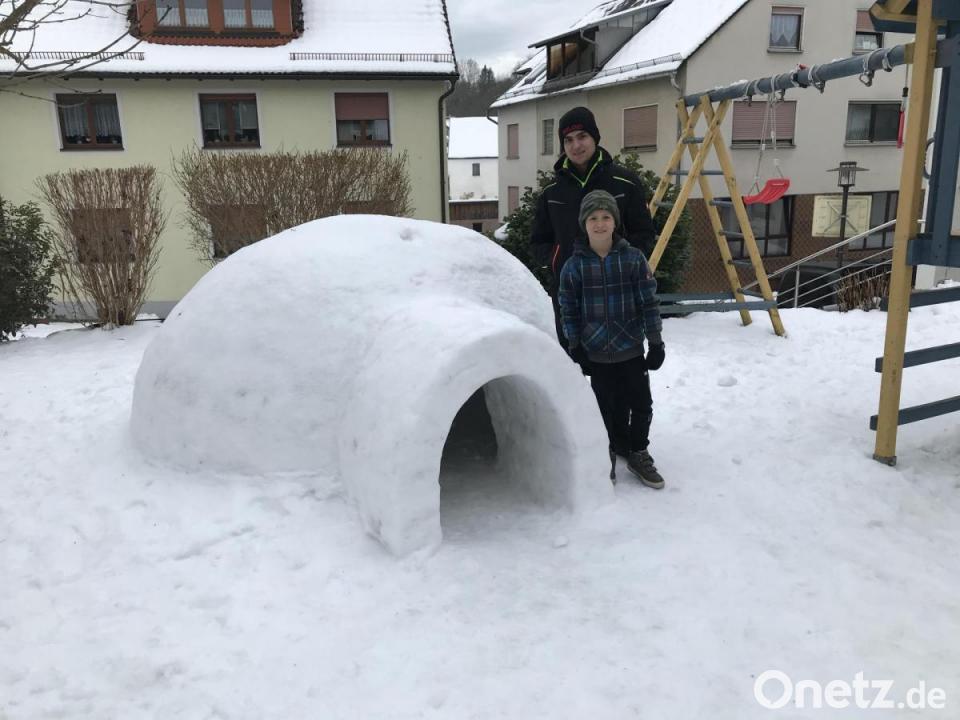 Bei Familie Zeitler in der Bahnhofstraße haben sich die beiden Kinder Jakob und Ferdinand ihren Wunschtraum erfüllt. Nach guten Schneeverhältnissen wurde mit dem Bau des Iglus begonnen. Dazu braucht man viele Schneeblöcke. Hierzu wurde Schnee in eine Plastikkiste geschaufelt und festgeklopft. Damit die Schneeblöcke nicht auseinanderfallen und das Gewicht der weiter oben liegenden Blöcke tragen mögen, muss der Schnee verdichtet werden. Stampfen funktioniert ganz gut, sich drauf setzen macht mehr Spaß. Danach wurde die Kiste gestürzt und somit entstand ein Schneeblock. Die Blöcke wurden dann mit dem Schlitten zum Bauprojekt gefahren.