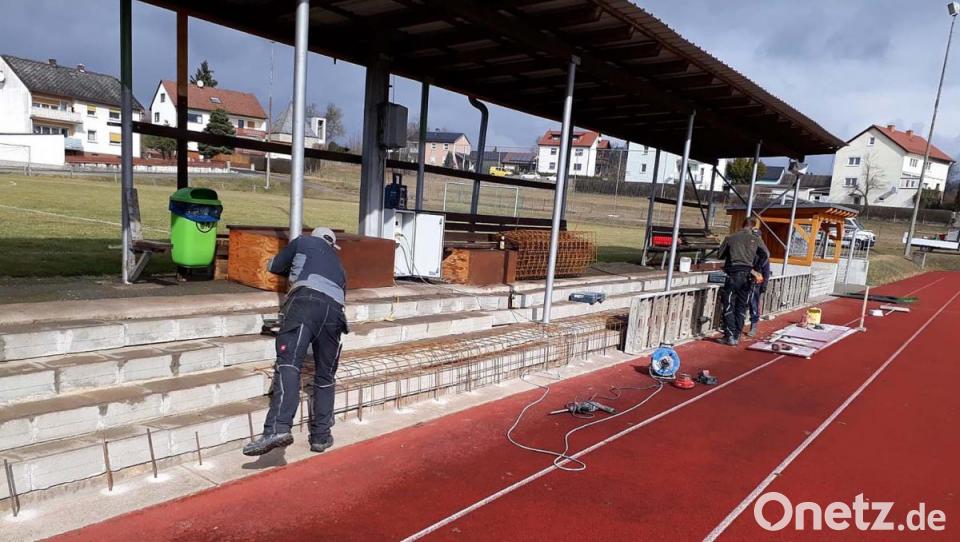 Jetzt fiel der Startschuss für die Erneuerung der abgewirtschafteten Tribünenstufen. Diese werden als Fundament benutzt und mit neuen Staffeln aus Transportbeton überbaut. Aus bisher vier Stufen werden nur mehr zwei, aber mit dem Vorteil, dass sie auch als Sitzfläche benutzt werden können. Die Schalung steht, jetzt kann der Baustoff geliefert und eingebaut werden.