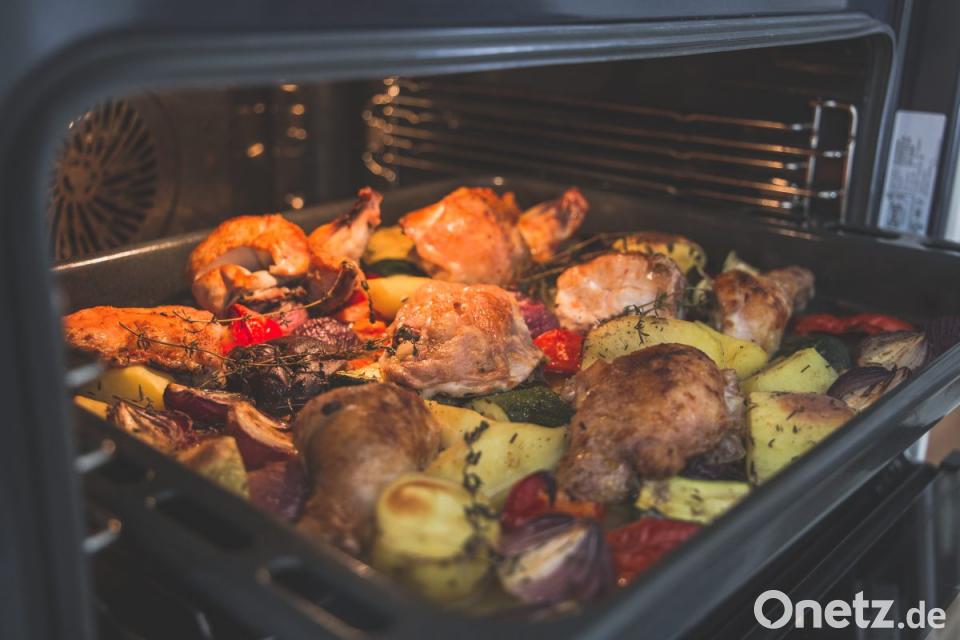 Zubereitung: Hähnchen in Portionsstücke teilen (Flügel, Ober- und Unterschenkel, Körper in der Mitte und noch einmal quer teilen) und mit Salz und Pfeffer würzen. Backofen auf 200 Grad vorheizen.