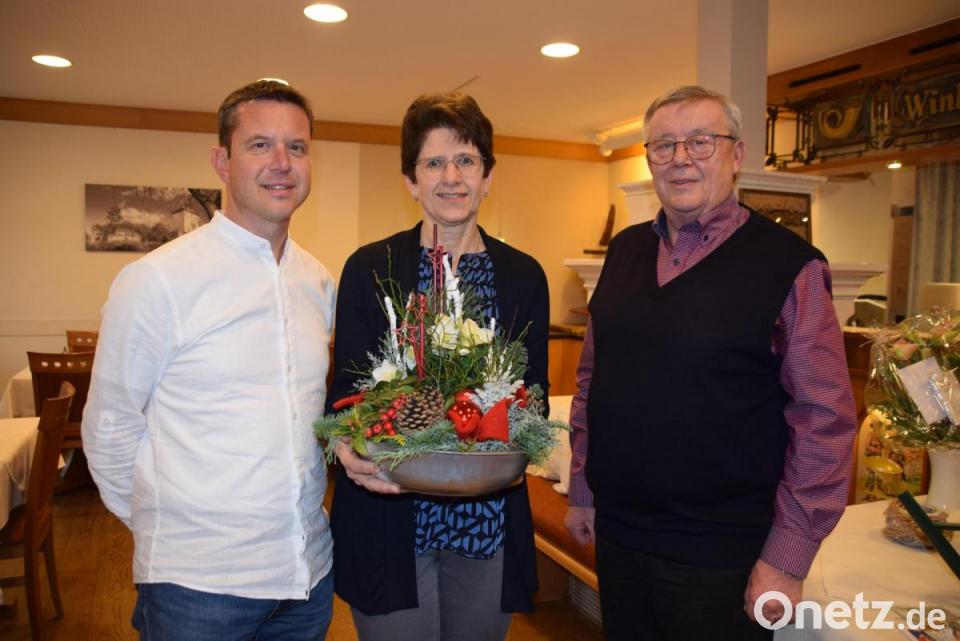 Bürgermeister Jörk Kaduk nannte als Eintrittsdatum von Heidi Ziegler den 1. April 1982. Der Markt Königstein stellte sie als Geschäftsführerin des Fremdenverkehrsvereins an, nachdem sie "Bürokaufmann", wie das damals auch für Frauen noch hieß, gelernt hatte. "Du hast dich mit dem Tourismusverein identifiziert und viel ehrenamtliches Engagement gezeigt", bescheinigte Kaduk. "Über 40 Jahre bei demselben Arbeitgeber ist schon was Besonderes." Er übergab Heidi Ziegler ein Geldgeschenk und ein adventliches Gesteck.