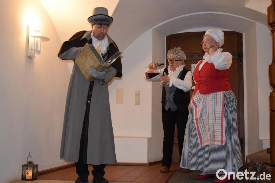 Das Rathaus war die letzte Station der Führung. Früher diente es als Brauhaus für das gute Königsteiner Bier. Zur großen Überraschung der Gäste kam der Sulzbacher Amtsarzt Christoph Raphael Schleis von Löwenfeld (Markus Lommer) ins Rathaus. In Begleitung des Apothekers Schießl (Helma Koch) befahl er der Wirtin (Cornelia Platzer), kein Bilsenkraut mehr ins Bier zu mischen, weil es giftig sei. Die Wirtin jedoch zeigte sich ziemlich uneinsichtig. Zum Schluss gab es noch - passend zur Vorgeschichte als Brauhaus - Oberpfälzer Biere für jeden zum Probieren: Zoiglbier, Alt-Amberger Hefeweizen und Urhell.