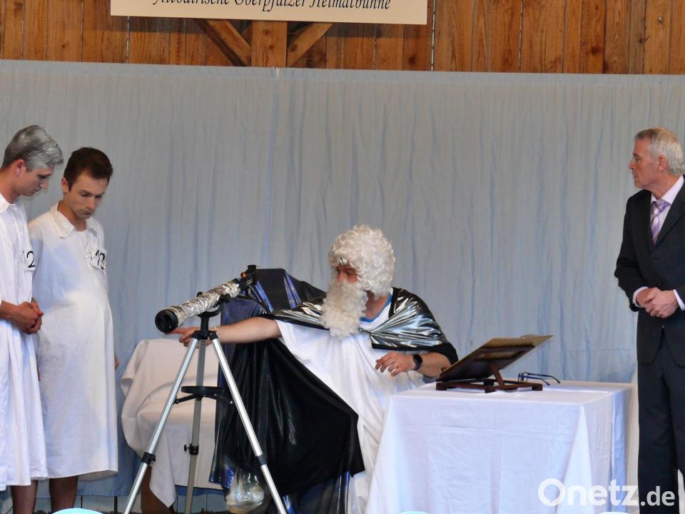 Für den zweiten Akt wurde die Bauernstube kurzerhand in eine Himmelspforte umdekoriert, was bei den Zuschauern Staunen hervorrief. Rosi Renner und Matthias Brunner hatten den Himmel, die Wolken, den Thron des Petrus und die Wettermaschine wunderschön gestaltet. Hier hatte Petrus (Christian Hirsch) seine liebe Not mit Engel Nr 13 (Marco Pirner) und Engel Nr. 25 (Ben Luber), die heimlich ins Himmelsrohr auf die Erde sahen, rauchten, Bier tranken und sich um die Politik stritten.