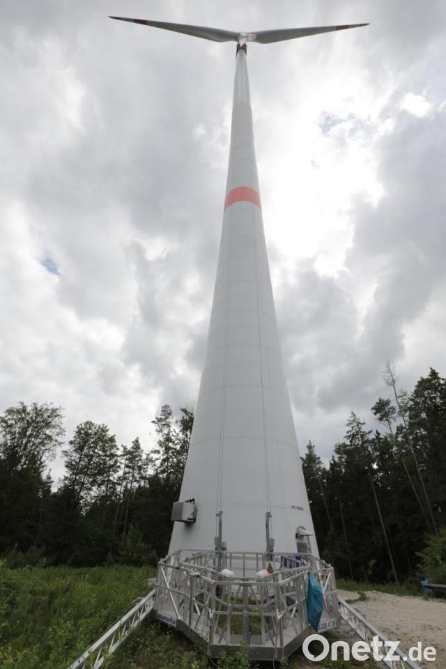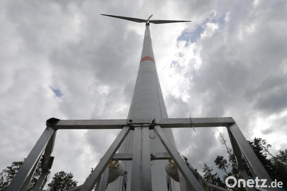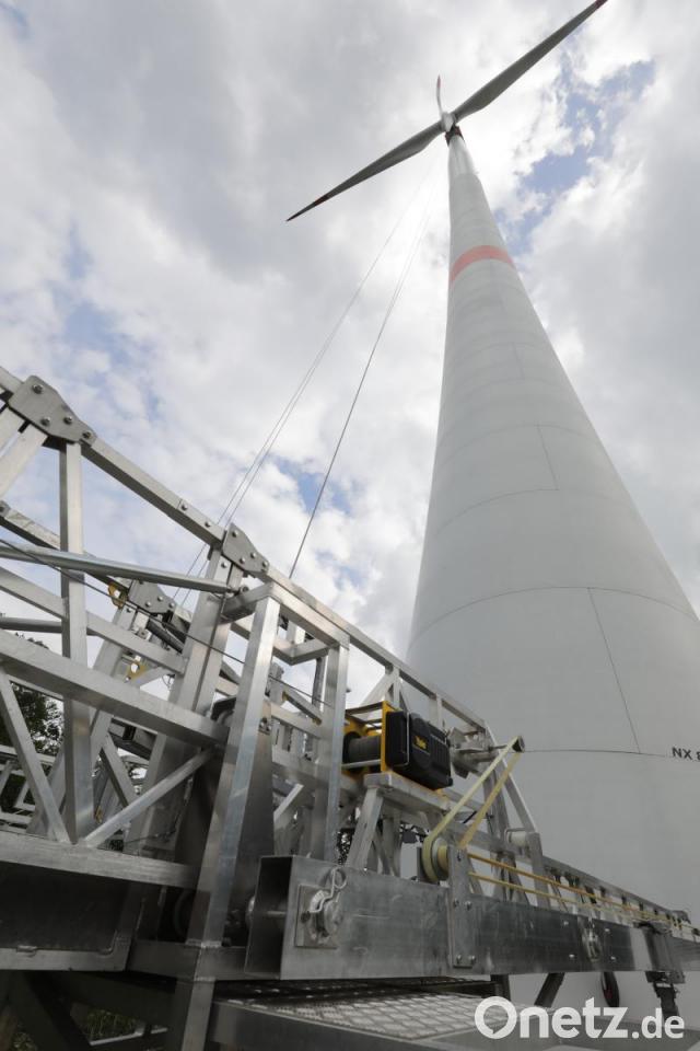 Wenn die Bühne oben ist, sieht es aus, als würde sie das Rotorblatt festhalten. So ganz falsch ist der Eindruck nicht, es geht drum, von diesem Metallgestell aus Reparaturen an den Rotorblättern vorzunehmen. "Das muss regelmäßig gemacht werden", erläutert Reinhard Kirchner, der für die technische Betriebsführung der beiden Anlagen der Bürgerwindenergie Königstein GmbH & Co. KG zuständig ist. "Da kommt ein Rotorblatt nach dem anderen dran." Kleinere Reparaturen seien nach jeder Inspektion zu erledigen, dieses Mal sei es etwas aufwendiger gewesen. "Die Rotorblätter sind ja der Witterung ganz schön ausgesetzt." Deshalb stünden die Windräder seit dem 16. Mai still, doch spätestens ab Christi Himmelfahrt sollen sie sich wieder drehen.