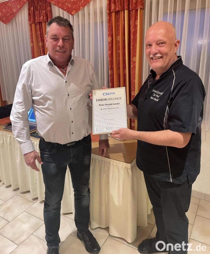 Bei den Ehrungen lagen für fünf Mitglieder Urkunden bereit. 50 Jahre Mitglied der CSU ist Erwin Graf aus Hannesreuth, der jedoch nicht selbst anwesend sein konnte. Ebenfalls verhindert war Herbert Schertl, der seit 25 Jahren dabei ist. Peter Pesold-Geisler nahm die Ehrung für 25 Jahre entgegen. Auf 10 Jahre in der Parrei blicken Christian Koch (nicht anwesend) sowie Thomas Kogelbauer zurück.
