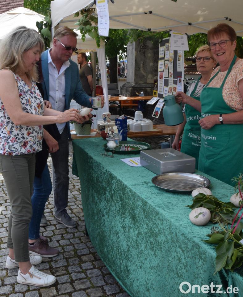"Kräuter, Blüten und Düfte" war das Thema des "Marktes der Genüsse" am Mittwoch, 1. Mai, auf dem Königsteiner Marktplatz. Traumhaftes Wetter lockte Besucherscharen aus dem Landkreis Amberg-Sulzbach und dem benachbarten Franken an. Händler boten Arbeiten aus Metall und Holz, Tierfiguren, Socken bis hin zur Betondekorationen, Buchfaltkunst, Seifen und Näharbeiten an. Zum ersten Mal vermarktete die ortsansässige Regens-Wagner-Stiftung Produkte aus ihrem Hofladen. Auch einige Vereine waren vertreten: Der Imkerverein verkaufte seine Honigprodukte, der Gartenbauverein tischte zum Kaffee Muffins und selbst gemachte Kuchen auf. Die Gemeindebücherei veranstaltete einen Bücherflohmarkt, und der Tourismusverein legte Informationsmaterial über den Markt Königstein und die Frankenpfalz bereit. Der Naturgarten „Hortus Bios“ aus Großschönbrunn warb zum ersten Mal beim Markt der Genüsse für eine pflanzen- und tierfreundlichere Welt. Eine Premiere war auch die Brennereibesichtigung bei der Familie Blendinger. Lisbeth Blendinger erklärte die Herstellung und ließ die Gäste Birnenschnaps probieren. Im Oberen Markt öffneten Irene und Armin Zeyher die historische Sattlerwerkstatt ihrer Familie zur Besichtigung. Kräuterexpertin Markusine Guthjahr führte durch die neue Duft- und Heilkräuteroase am Kneipp-Becken. Heidi Ziegler, die Vorsitzende des Tourismusvereins, freute sich sehr über den tollen Erfolg der Veranstaltung. Der nächste "Markt der Genüsse" findet am 3. Oktober statt.