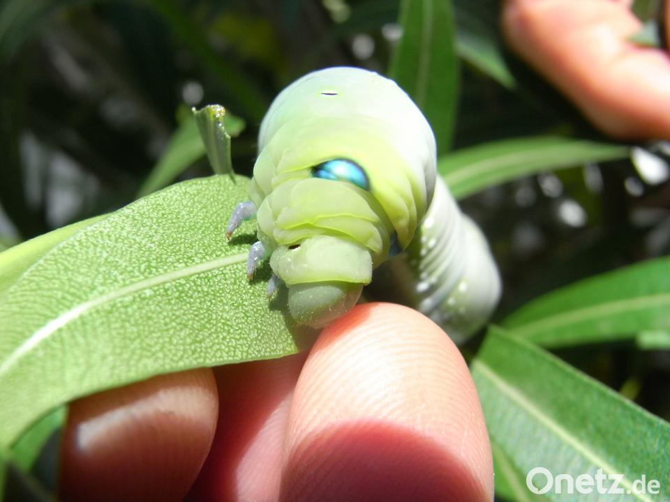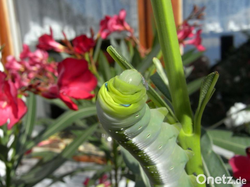 Die Raupe des Oleanderschwärmers wird größer als ein Zeigefinger, ist aber völlig harmlos.Und den Oleander frisst sie auch nicht kahl. Nur weil es dieses Jahr gar so heiß und trocken ist, kommt der Nachtschwärmer überhaupt bei uns vor. Das geschieht sehr selten. Oft ist es dem Schmetterling, der eine Flügelspannweite von zwölf Zentimeter erreicht, selbst in den Ländern rund ums Mittelmeer fast zu kalt. Das Königsteiner Klima sagt ihm dagegen heuer zu. Die Familie Bruhn am Thorstein freut sich an den seltenen Tierchen und verzichtet dafür gerne auf ein paar Oleanderblätter.