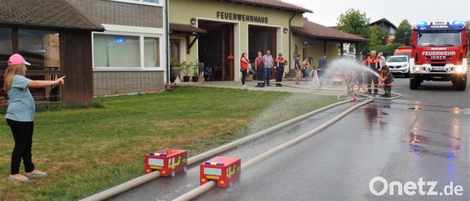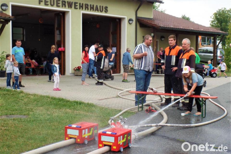 Nicht nur die Jugendlichen hatten bei dem besonderen Einsatz ihren Spaß, auch die Aktiven der Wehr, ihre mit eingespannten Frauen, viele Eltern und Großeltern erlebten am Samstagnachmittag viel „Äktschn“. An acht verschiedenen Spielstationen amüsierten sich die Kinder, löschten brennende Häuser, fuhren Löschfahrzeug-Rennen mit Wasserstrahlantrieb, malten und bastelten. In langen Schlangen warteten sie auch darauf, im neuen Feuerwehrauto mitfahren zu dürfen. Natürlich mit Blaulicht und Horngetute. Sogar echtes Sirenengeheul umrahmte kurz den „Einsatz“, denn es gab den routinemäßigen Probealarm. Dass auch von oben ein paar Mal Löschunterstützung kam, tat dem Vergnügen keinen Abbruch.