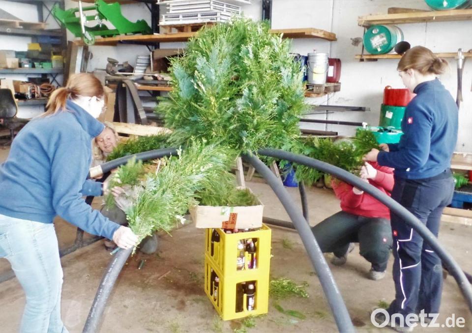 Rund drei Stunden brauchten die Damen, um die komplette Krone mit Strauchwerk und Buchs zu schmücken. In dieser Woche bringen die Grünbauers die 1,80 Meter hohe und mit drei Metern Durchmesser imposante Osterkrone zum Marktbrunnen. Wo es nochmal Zeit braucht, um einige Hundert farbige Eier dran zu binden, sobald sie auf dem Brunnenrand sitzt.