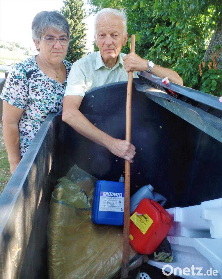 Doch was sie jetzt erleben mussten, schlägt wohl dem Fass den Boden aus: Da steht gleich am Friedhofseingang ein großer Rollcontainer für Blumentöpfe und sonstigen Plastikabfall. Und der wird auch regelmäßig geleert, so wie vor kurzem wieder. „Als ich dann nach ein paar Tagen da reingeschaut habe, dachte ich, jetzt trifft mich der Schlag“, empört sich Willi Landgraf und fügt leise lächelnd hinzu: „Na ja, dann wäre ich ja schon gleich auf dem Friedhof gewesen.“ Was er sah, waren eingesackte Teppichreste, Matratzenschoner, Styropor-Verpackungen, Kissenreste, Ölkanister - sogar für Kettenöl - und so weiter. Kopfschüttelnd mutmaßt Landgraf: „Die Verstorbenen werden wohl keine Schmierung mehr brauchen.“ Seine Frau ergänzt: „Wenn das alles nicht so traurig wäre, könnte man ja darüber lachen.“