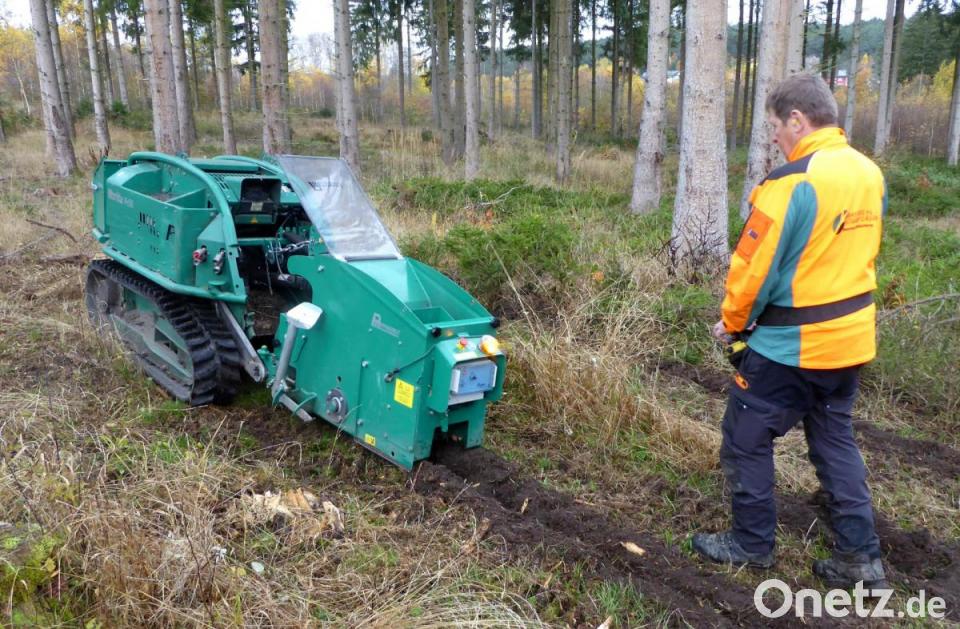 Drei Tage lang fanden in einem Waldstück des Staatsforstes zwischen Röthenbach und Kohlberg Maßnahmen zur Waldverjüngung und zum Waldumbau statt. Dabei wurden zehn Zentner Eicheln, die in einem benachbarten Wald mit am Boden ausgelegten Netzen eingesammelt wurden, ausgesät. Aber nicht wie früher per Hand, sondern durch eine erstmals zum Einsatz gekommene ferngesteuerte Multifunktionsraupe.