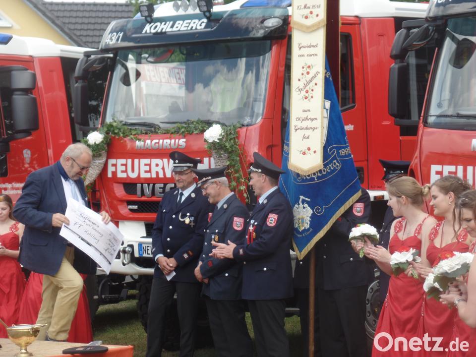 Zweiter Kommandant Matthias List meldete das LF 10 mit dem ersten Funkspruch bei der Leitstelle an. Mit dem Wunsch nach allzeit guter Fahrt wurde sein Anruf bestätigt. In seiner kurzen Rede wünschte Bürgermeister Götz den Feuerwehrleuten viel Freude an dem Fahrzeug. Auch stellvertretender Landrat Albert Nickl übergab nach seinem Grußwort im Kuvert einen finanziellen Beitrag. Jürgen Trost aus Kohlberg am Jusi hatte einige Flaschen heimische Obstbrände für besondere Stunden dabei. Vorsitzender Stefan Groß aus Burkhardsreuth dankte für die Bereitschaft, auch ihr Fahrzeug mit in die gemeinsame Bestellung aufzunehmen. Vorstand Prechtl lobte die Zusammenarbeit der Aktiven, allen voran die der Kommandanten Fischer und List: "Die beiden haben viele, viele Stunden für dieses Ereignis geopfert!"