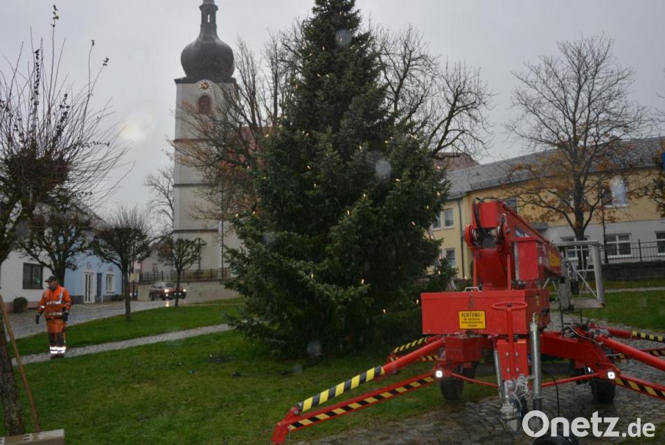 Am Therese-Neumann-Platz in Konnersreuth wird in der Advents- und Weihnachtszeit wieder ein Christbaum erstrahlen. Bei teils strömendem Regen stellten Bauhofmitarbeiter am Donnerstag eine stattliche Tanne auf und brachten mit Hilfe eines Hubwagens eine Lichterkette an. Der Baum stammt aus dem Garten einer Familie an der Nickl-Leibold-Straße. Aus Energiespargründen werden die Lichter aber nur samstags, sonntags und an Feiertagen brennen.