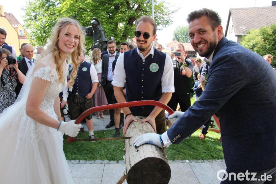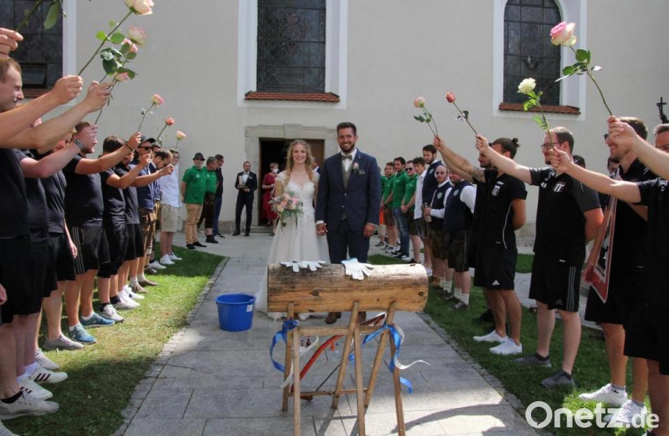 Nach dem Gottesdienst wurde vor der Kirche ein großes Ehrenspalier für das Brautpaar gebildet. Vor Ort waren die Fußballer des SV Pechbrunn-Groschlattengrün und des TSV Konnersreuth, außerdem Mitglieder des Burschenvereins Pechbrunn, die zum Holzsägen einluden, und Arbeitskollegen des Bräutigams von der Firma Kassecker aus Waldsassen. Die Stadtkapelle Waldsassen überraschte das Paar mit einem Ständchen.