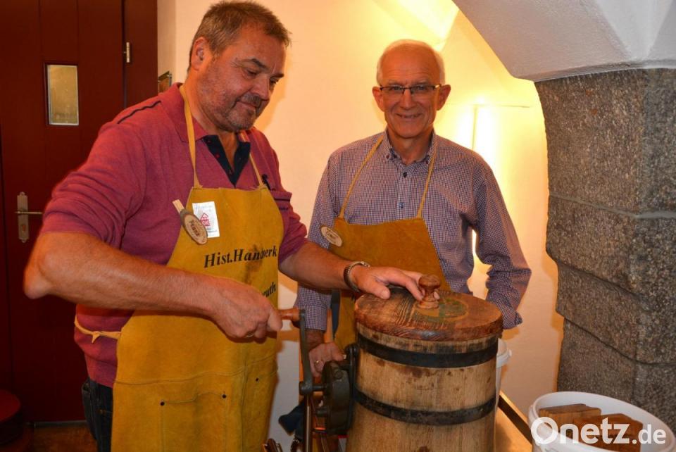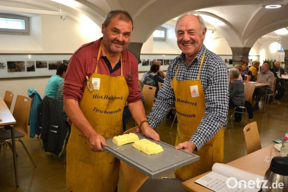 Mit dabei waren wieder der "Sitzweilgsang" mit Monika Kunz und Inge Härtl sowie Margot Sölch am Keyboard. Höhepunkt des Nachmittags war das Ausbuttern mit Herbert Konrad und fünf Mitstreitern vom Arbeitskreis Historisches Handwerk aus Tirschenreuth. Sie hatten auch jede Menge Informationen dabei und stellten ihren Verein näher vor. Im Zuge ihrer Vorführung wurden zunächst dreieinhalb Liter Rahm in ein Butterfass geschüttet, ehe durch kräftiges 15-minütiges Drehen daraus rund zwei Pfund Butter und 1,5 Liter Buttermilch entstanden. Natürlich durften die Besucher kostenlos probieren. Und so gab es neben Kirwakuchen auch frisch geschmierte Butterbrote mit etwas Petersilie, was bei den Besuchern sehr gut ankam. Um das leibliche Wohl kümmerten sich erneut Mitglieder der örtlichen Frauen-Union.