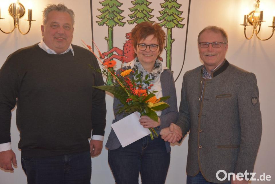 Großer Tag für Sibylle Schiedeck: Sie wurde von Bürgermeister Max Bindl und Geschäftsleiter Markus Troesch für ihre 25-jährige Tätigkeit in der Marktverwaltung geehrt. Am 1. Januar 1994 begann die gebürtige Haingrünerin ihren Dienst im Konnersreuther Rathaus. Im Einsatz ist sie im Einwohnermeldeamt und im Passamt, bei der Erstellung von Abwasser- und Wasserbescheiden sowie als Wahlsachbearbeiterin. Bürgermeister Max Bindl sprach von einer stets zuverlässigen und freundlichen Mitarbeiterin und dankte mit einem Blumenstrauß, einer Urkunde sowie einer Gratifikation. „Ein herzliches Dankeschön für 25 Jahre Dienst in unserem Rathaus“, sagte Bindl. Die Glückwünsche der Kollegen überbrachte Geschäftsleiter Markus Troesch. "Es war immer eine schöne Zeit", betonte Sibylle Schiedeck zurückblickend.