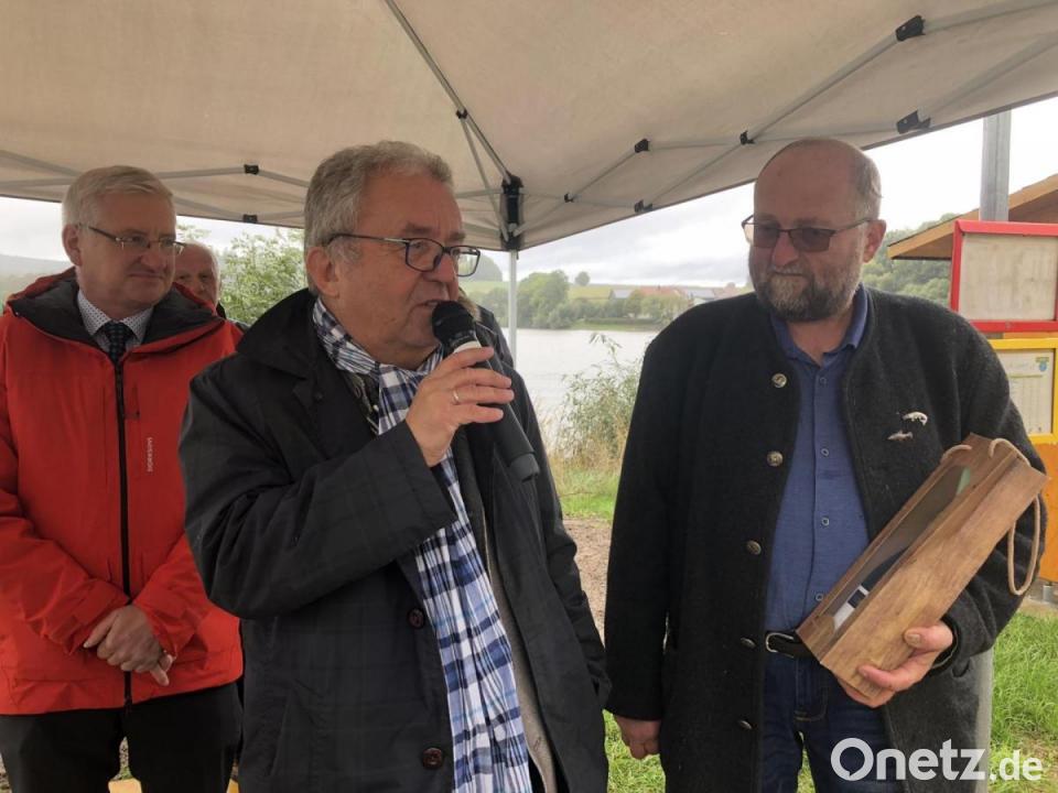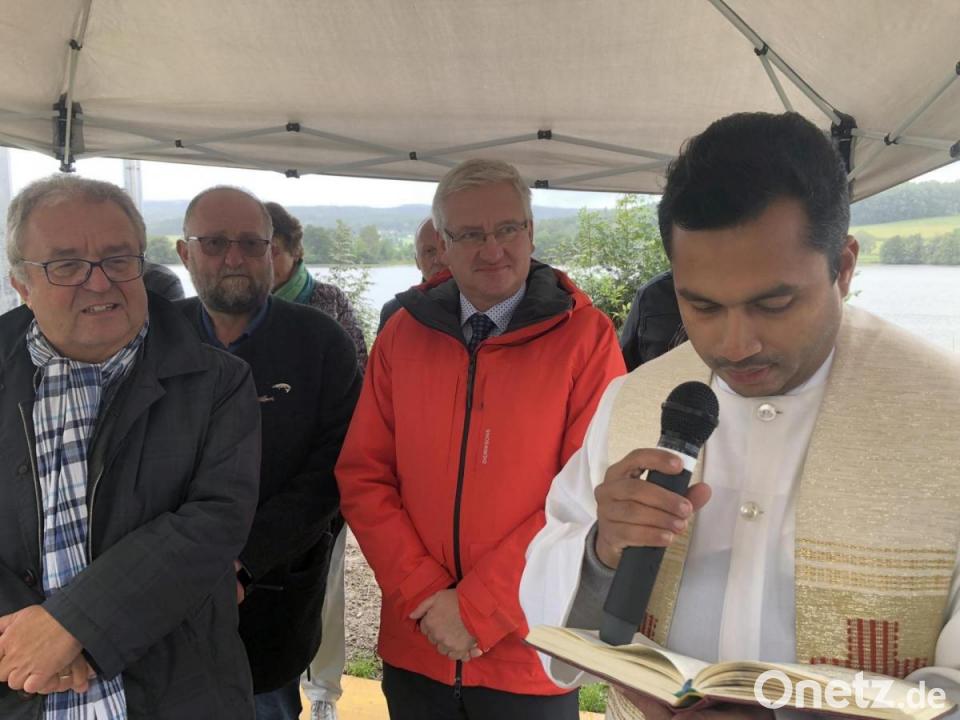 Johannes Reger, Vorsitzender der Steinwald-Allianz, würdigte das hohe Ansehen der, so betonte er wörtlich, „Karpfenstadt Kornthan“. Humorvoll kommentierte der Erbendorfer Bürgermeister den anhaltenden Regen an diesem Tag: „Fische brauchen Wasser, es bringt Farbe ins Dorf.“ Unter dem schützenden Dach des bereitgestellten Pavillons machte er deutlich, dass die Fördersumme gut angelegt sei. Die Förderung sei für Projekte bestimmt, um "gelungene Orte zu schaffen, wo Menschen zusammenkommen“. Auf diesen schönen Ort, wo auch zum Gebet geläutet wird, könne man stolz sein, meinte Reger vor der Andacht mit Pater James George und der anschließenden Segnung.