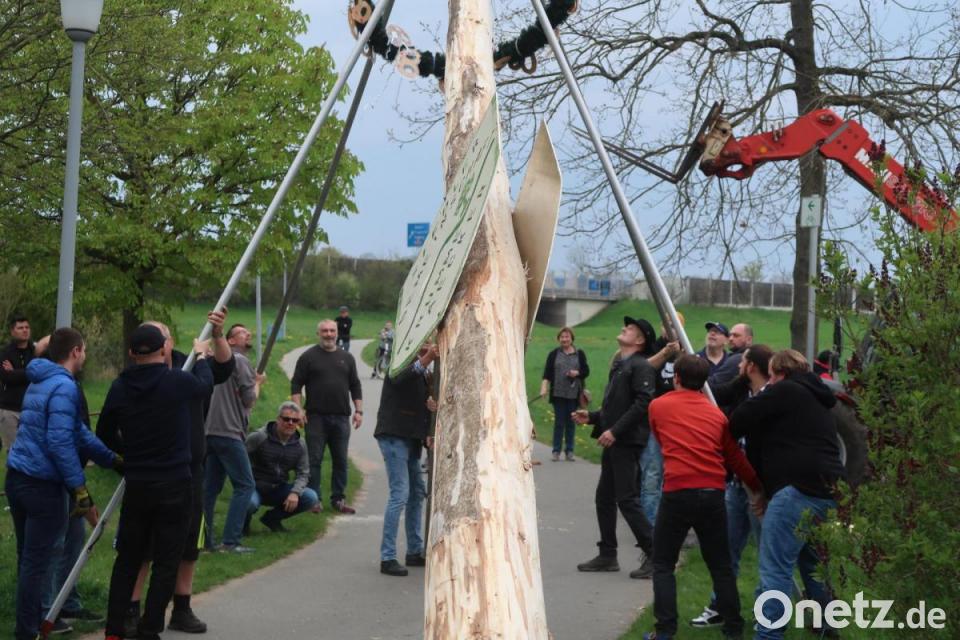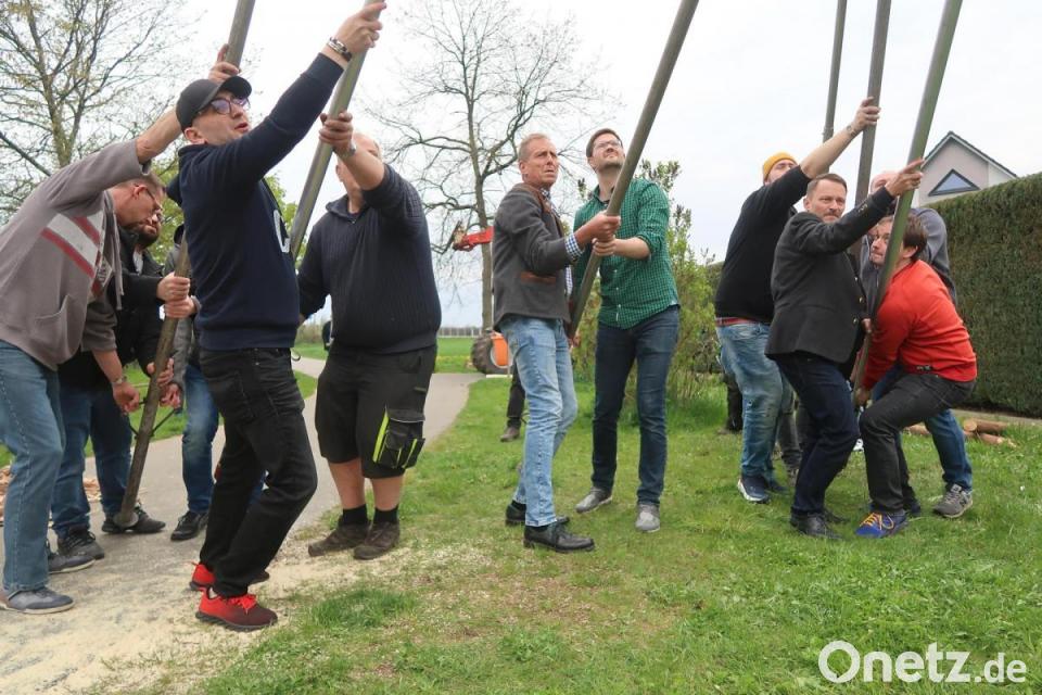 Krumme-Äcker-Siedler stemmen Maibaum mit Muskelkraft