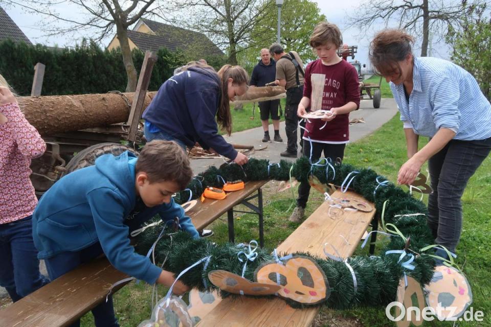 Der Maibaum der Krumme-Äcker-Siedler ist 18 Meter hoch und wurde am Maifeiertag gefällt. Der alte war während der beiden Coronajahre morsch geworden und wandert nun stückweise in die Kachelöfen. Kindergartenkinder vom Haus Lorenz-Werthmann hatten am Sonntagnachmittag den mächtigen neuen Stamm geschmückt und sangen zum Festauftakt hinterm Siedlerhäuschen die Europahymne. Unter Leitung ihres Vorsitzenden Wolfgang Pausch schoben starke Männer aus der Siedlung den Maibaum nach alter Väter Sitte mit langen Stangen hoch in Senkrechte.