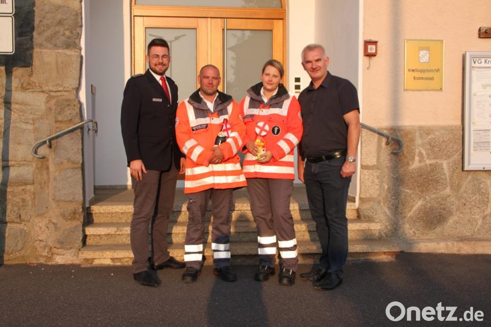 (den) Ein kleines Jubiläum feierten die beiden Krummennaaber Helfer vor Ort, Pia und Bernhard Hanny. Die beiden wohnen erst seit März 2017 im Ort, genauer in Burggrub, engagieren sich aber bereits seit fast genau einem Jahr beim BRK. Bereitschaftsleiter Sven Lehner zeigte sich mächtig stolz auf das Powerpärchen. Neben Familie, Job, Haushalt und Hunden haben die beiden in diesem Jahr fast 50 Einsätze absolviert. Davon allein neun Einsätze im Monat August.