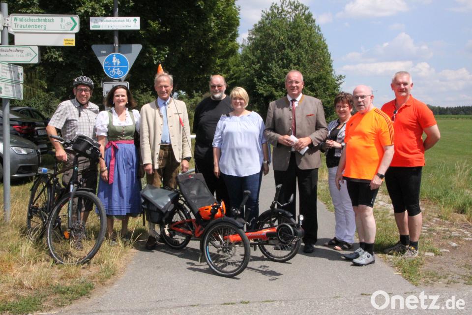 Die Teilnehmer der Fahrradsternfahrt zu den „Simultankirchen des Jahres“ sind die ersten, die sich über den druckfrischen Kirchenführer freuen. Mit dabei (von links): Pfarrer und Vorsitzender des Fördervereins Hans-Peter Pauckstadt-Künkler, Elvira Freifrau von Lindenfels und Bertold Freiherr von Lindenfels, Historiker Harald Stark, Pfarrerin Nadine Schneider, Bezirkstagspräsident und Schirmherr Franz Löffler, Kreisrätin Brigitte Scharf, Regionalbischof Hans-Martin Weiss und Bürgermeister Uli Roth.