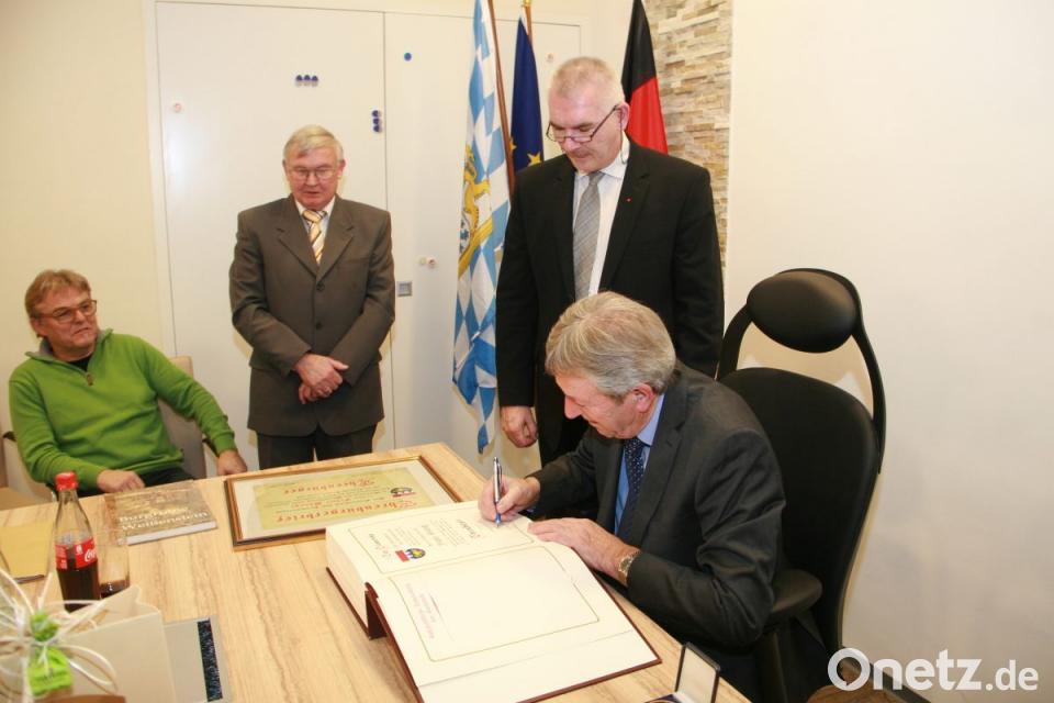 Anlässlich der Festsitzung und Ernennung Stangls hatte Bürgermeister Uli Roth eine Seite im „Goldenen Buch“ schmücken lassen. Der Eintrag folgte im Anschluss an die Übergabe des Ehrenbürgerbriefes. „Dankbar und stolz nehme ich die Auszeichnung entgegen“, wandte sich der Geehrte an die Versammelten. Ebenso mit Stolz trage er auch die Ehrenbürger-Nadel, versprach der Altbürgermeister und frischgebackene Würdenträger der Gemeinde Krummennaab.