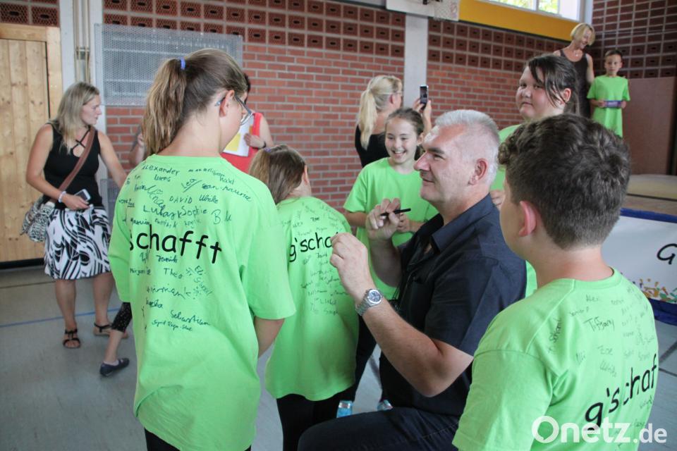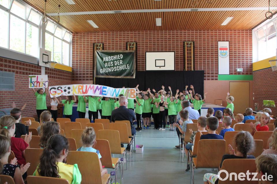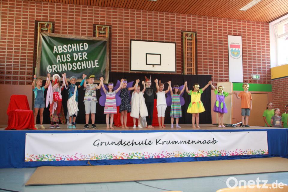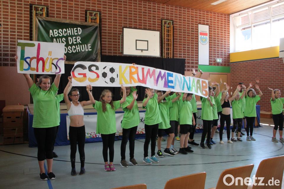 Bürgermeister und Schulverbandsvorsitzender Uli Roth erklärte den Viertklässlern, dass sie "ungefähr, ziemlich genau" 1000 Tage an der Grundschule verbracht hatten. Er hoffte, dass "eure Eltern viel Spaß beim Lernen mit euch hatten" und überreichte gemeinsam mit Bürgermeisterkollege Werner Prucker jedem eine Tafel Schokolade. Zum Abschluss holten sich die Kinder ihren Klassenleiter Wolfgang Schraml für die schönsten Verabschiedungsfotos auf die Bühne. Bürgermeister Roth durfte sich auf den Abschluss-T-Shirts verewigen.