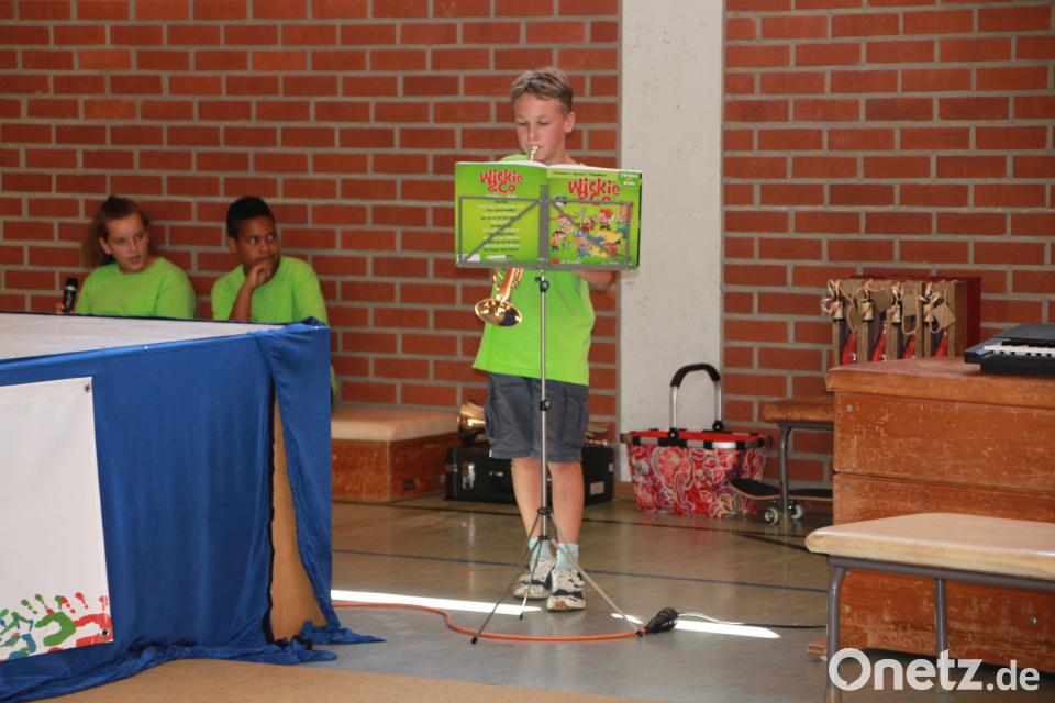 Mit einem schwungvollen "Boogie" begrüßte Sebastian am Klavier die Gäste in der Mehrzweckhalle. Die Schulspielgruppe der dritten Klassen hatte extra für diesen Tag das Stück "Irgendwie anders" einstudiert. Der blaue "Irgendwie Anders" findet hier am Ende mit dem roten "Etwas Anders" doch noch einen Freund. Während der Umbauarbeiten auf der Bühne setzte sich wieder Sebastian ans Klavier. Die Tanzgruppe der vierten Klasse präsentierte mit bunten Bändern das Lied "On the floor".
