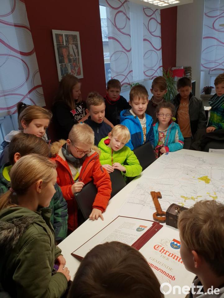 Einen Blick in das dickste Buch der Gemeinde durften die Schüler der beiden 4. Klassen der Grundschule Krummennaab im Büro des Bürgermeisters werfen. In der Chronik sind alle wichtigen Ereignisse festgehalten, zum Beispiel der jährliche Rathaussturm der Krummennaaber Garde zu Faschingsbeginn.