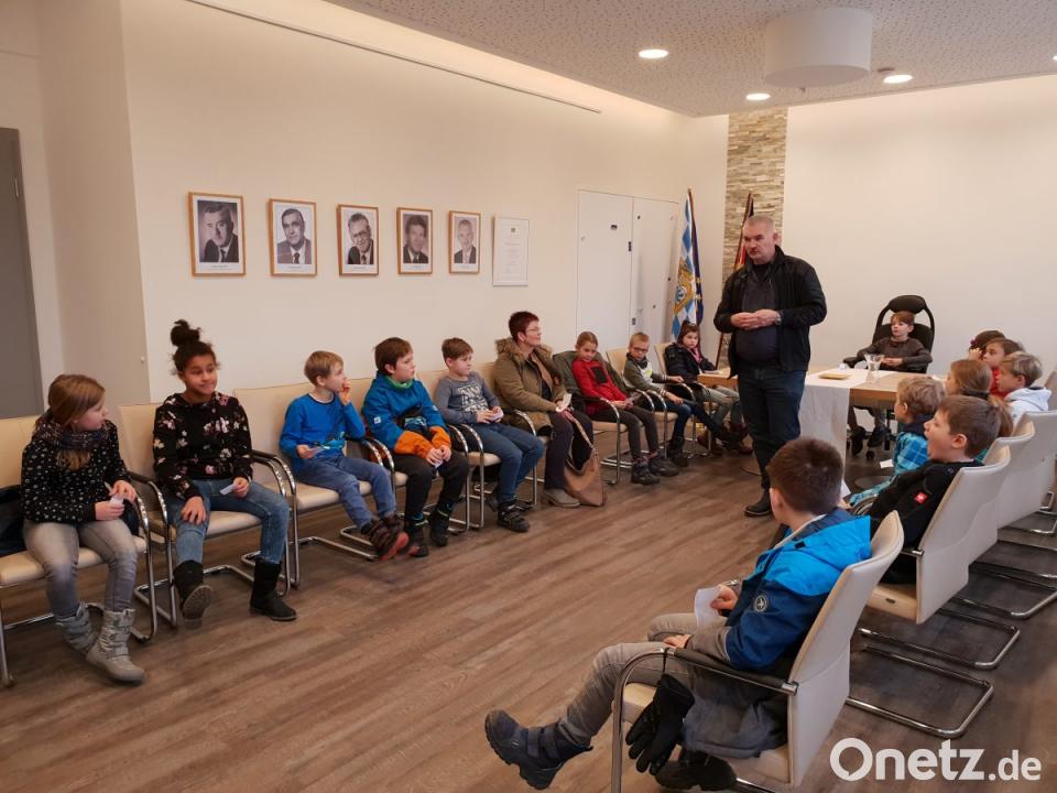Bürgermeister Uli Roth wusste auch viel Geschichtliches über die Namen der einzelnen Ortsteile zu berichten. Im Einwohnermeldeamt durften zwei Kinder am Computer kontrollieren, ob sie in der Gemeinde richtig erfasst sind.