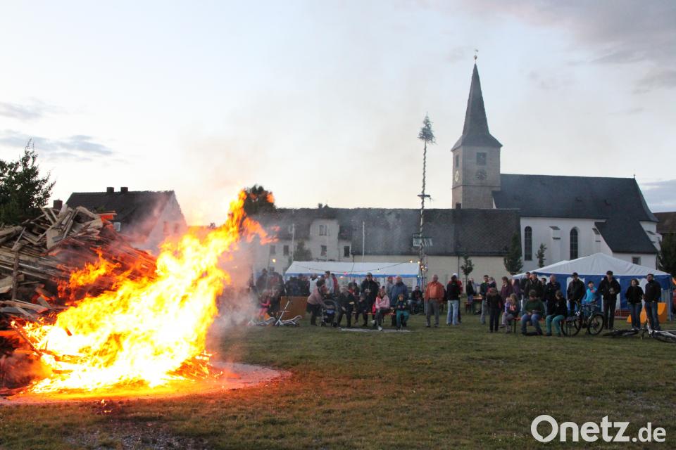 Die Feuerwehr hatte den Platz dafür bestens präpariert. Im Bier- und Weinzelt hatten die Kameraden sogar extra Heizstrahler für die zahlreichen Besucher aufgestellt. Kommandant Markus Krenkel stand mit seiner Gattin Karin am Dotschgrill, in der zweiten Bude stand Vorsitzender Matthias Reul am Herd und servierte selbst gekochtes Chili und Pommes. Im Weinzelt kümmerte sich zweite Vorsitzende Stefanie Sieder um die Gäste. Schriftführerin Julia Jakob war für Käse, Brezen, Lachs- und Fischsemmeln zuständig. Daneben gab es natürlich noch Bratwürste vom Grill. Die Damen der Feuerwehr bedienten derweil die Gäste im frisch reparierten Bierzelt - kurz zuvor hatte eine Sturmböe einige Stangen eingedrückt. Für die Krummennaaber Kameraden allerdings kein Problem: Sie ersetzten die geknickten Rohre und stellten das Zelt wieder auf. Die beiden Zelte waren auch den gesamten Abend voll besetzt. Nach einem kurzen Regenschauer belohnte der Himmel die Besucher mit einem fantastischen Regenbogen. Bei Einbruch der Dunkelheit entzündete zweiter Kommandant Martin Gruber das Johannisfeuer. Dazu gesellten sich viele Zuschauer und wärmten sich am Feuer.