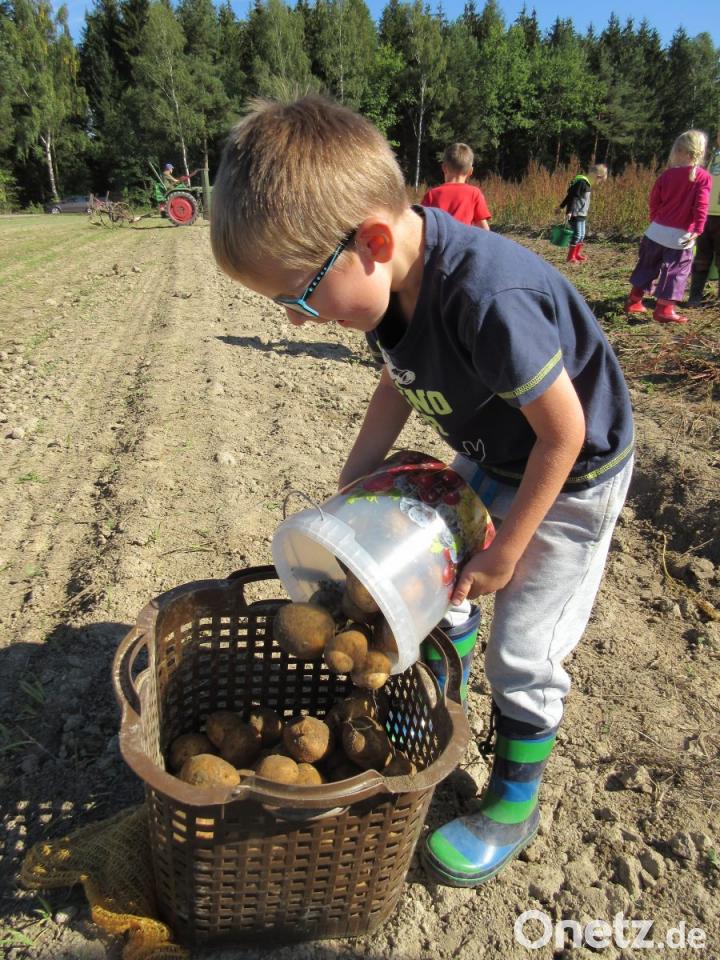 Dort wartete bereits Reinhold Neubauer und seine Familie auf die Kinder. Neubauer hatten diese zum Kartoffelklauben auf ihr Feld eingeladen. Zuerst einmal durften sie zuschauen, wie Neubauer mit der Grabgabel die Kartoffeln aus der Erde herausholte. Er erzählte den Kindern, dass ab 1956 mit einem Kartoffelernter, den ein Traktor zieht, die Kartoffeln ausgegraben wurden. Auch diese Erntemethode zeigte er den Kindern. Mit großem Eifer sammelten die Mädchen und Buben die Kartoffeln auf. Die Kinder staunten über die verschiedenen Größen und Formen der Kartoffeln, sehen doch die im Geschäft gekauften alle ziemlich gleich aus.