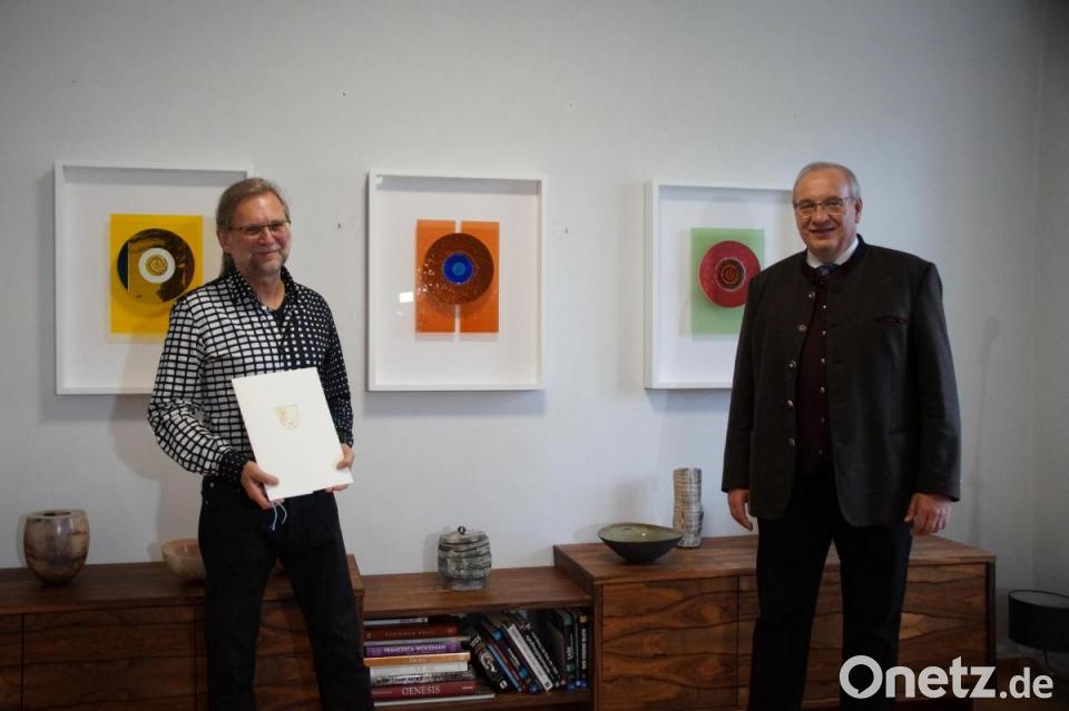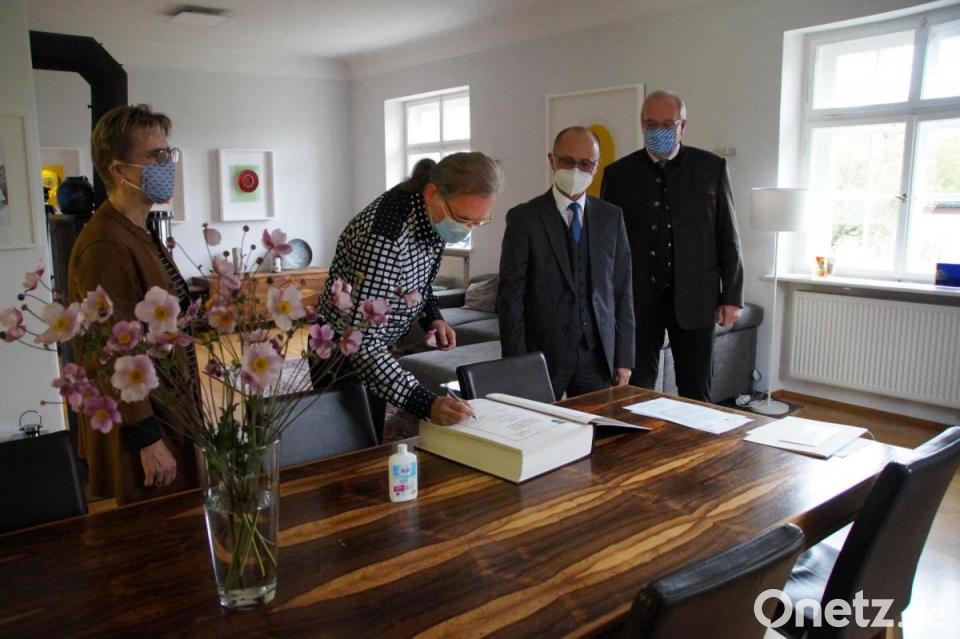In Vertretung für Landrat Roland Grillmeier überbringt Alfred Scheidler Glückwünsche zu dieser Auszeichnung. "Kultur vermittle Orientierung und Identifikation mit der Heimat", so der stellvertretende Landrat. Und Bürgermeisterin Marion Höcht sagt: "Wir sind stolz, einen Künstler wie Sie bei uns im Dorf zu haben." Die Rathauschefin hat auch das Goldene Buch der Gemeinde Krummennaab mitgebracht, in welches sich Bernhard Dagner eintragen darf.