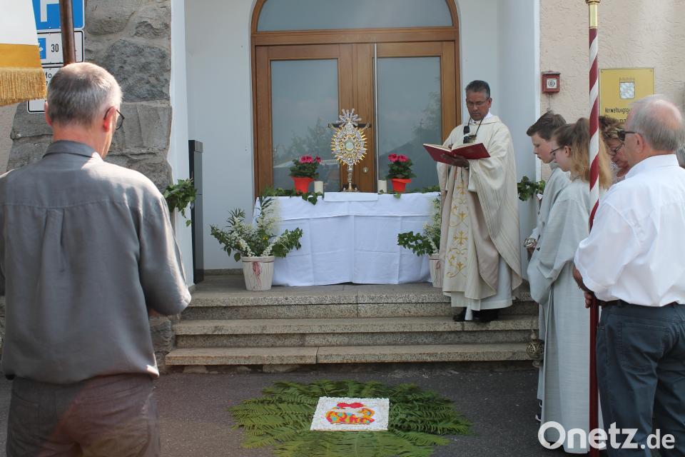 Weiter ging es über den Kirchsteig zur Grundschule, wo der Frauenkreis den 2. Altar errichtet haben. Aufgrund der warmen und schwülen Wetterlage hat man sich kurz vor dem Beginn des Gottesdienstes dazu entschieden, den kürzeren Prozessionsweg direkt zum Rathaus zu gehen.