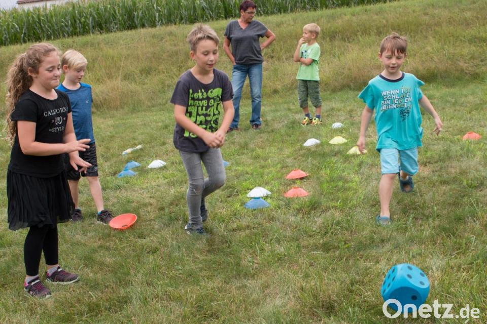 Ein großer Würfel, 16 farbige Markierungskegel und ein Kreidespray und schon kann es losgehen. Im Krummennaaber Ferienprogramm stand das klassische Brettspiel "Mensch ärgere Dich nicht" auf dem Programm. Aber in einer ganz anderen Art und Weise, wie es wahrscheinlich noch keiner zuvor gespielt hat - und zwar im Freien und im XXL Format. Dazu hatte Jugendbeauftragter Andreas Heinz die nötigen Utensilien aus der Schulturnhalle geholt und mithilfe einer Vorlage das Spielfeld auf der Badewiese am Erlenweiher in Thumsenreuth aufgezeichnet. Jedes Kind übernahm eine Spielerfarbe und nach einer kurzen Einweisung in die Spielregeln starteten die zwei Partien.