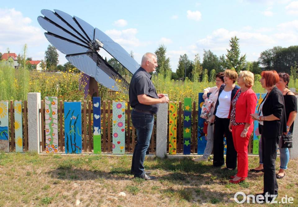 Besonders angetan zeigten sich die Staatssekretärin und die weiteren Besucher von den beiden „Solarblumen“ auf dem Gelände: Diese Photovoltaik-Anlagen richten ihre Rotorblätter computergesteuert immer nach dem Sonnenstand aus. Die so gewonnene Energie werde eigengenutzt beziehungsweise eingespeist. Diese „Blumen“ stehen inmitten von echten Sonnenblumen in einem Bauerngarten, dessen Zaun von Grundschul- und Kindergartenkindern durch kunstvoll bemalte Bretter verschönert wird. Auch die Liegen in den Farben der Gemeinde, so Roth, seien nicht nur Hingucker, sondern würden auch intensiv genutzt.