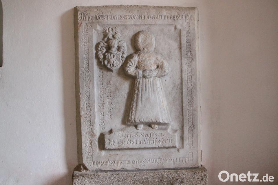 Nach den historischen Fakten vor der Kirchentür lud Schneider ein, sich im Gotteshaus umzusehen. Sie erklärte die einzelnen Altarbilder und dass der Altar eigentlich zu groß sei. "Sehen Sie ganz oben das Kreuz? Das ist nach hinten gekippt, weil es sonst nicht passt", erläuterte die Pfarrerin. In der Krummennaaber Kirche sei es der Grabstein von Louis Anne de Sainte Marie Eglise, der unter der Kanzel liegt und sie besonders fasziniere. Im Eingang steht der Grabstein der Pfarrerstochter Barbara Dümler. Schneider verlas die Umschrift und zeigte sich vom Schicksal des kleinen Mädchens berührt.