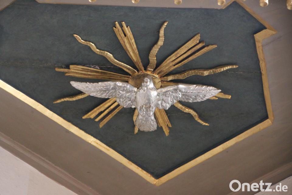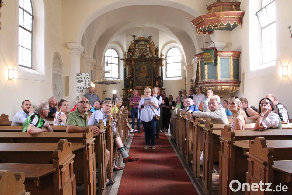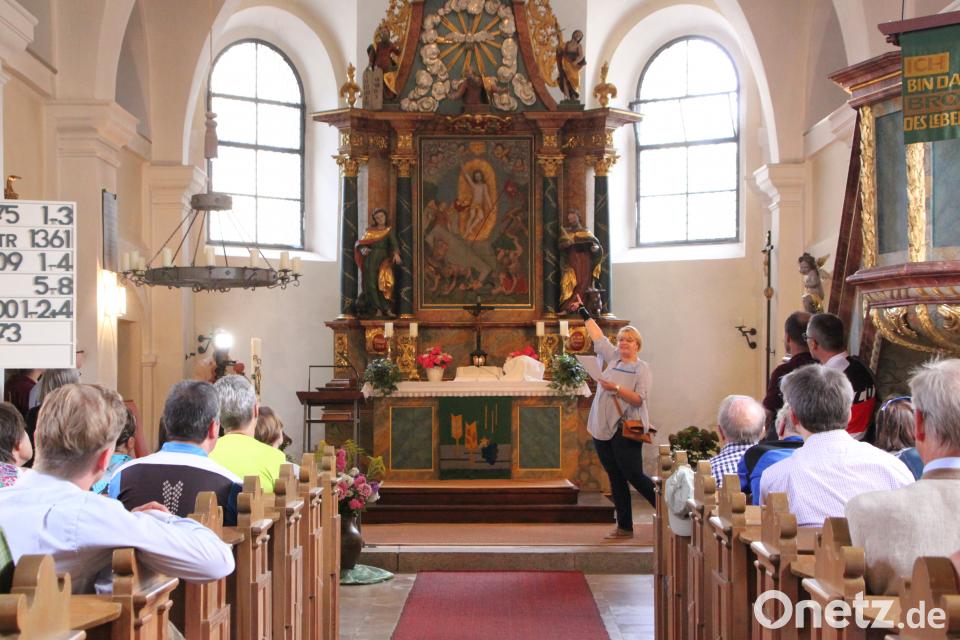 Schneider begrüßte die Gäste bereits vor der Tür zur Ädigienkirche. Hier erläuterte sie die historischen Fakten. Anschließend bat sie alle in die Kirche. Beginnend mit dem Altar wies die Pfarrerin auf die verschiedenen Besonderheiten der Thumsenreuther Kirche hin. Ein besonderes Stück hatte sie dafür extra aus dem Tresor hervorgeholt: Die Abendmahlskanne von 1681, gestiftet von Eva-Barbara von Lindenfels. Der kleine Putto am Aufgang zur Kanzel hatte es nicht nur Schneider besonders angetan.