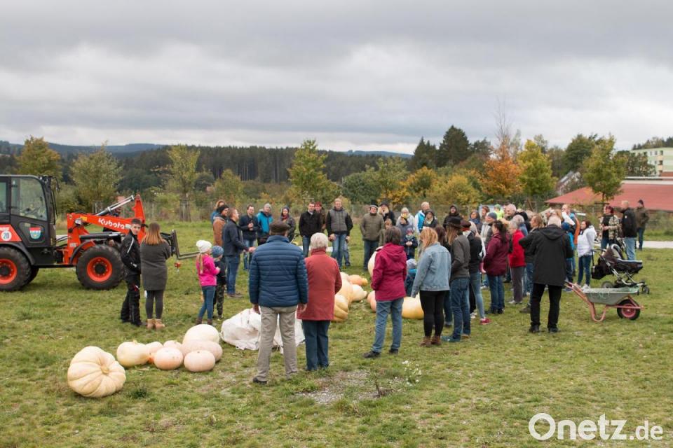 Die als Riesenkürbis bekannte Sorte "Atlantic Giant" machte ihrem Namen aller Ehre. Schon aus der Ferne waren die auffallenden Kolosse zu sehen und luden Besucher zum Schlendern und Verweilen in den Park ein. Vor dem Wiegen der Kürbisse wurden alle Exemplare auf einem Platz gesammelt. Voller Stolz trugen die Hobbygärtner ihre Früchte aus dem Kürbisfeld. Für einige Kürbisse reichte die reine Muskelkraft nicht aus und ein Radlader musste eingesetzt werden. Allerdings schaffte es nicht jeder Kürbis, seine Pracht bis zur Prämierung zu erhalten.